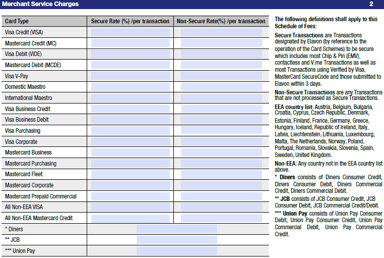 I 2016 innførte Elavon nye definisjoner for ulike typer transaksjonsbehandling – «sikre» og «ikke-sikre». Forhandlerens serviceavgift (FSA) er høyere for usikre transaksjoner. Avgiftsplanen fra 2016 sa at sikre transaksjoner er: «Chip og pin (EMV), kontaktløs, V.me-transaksjoner, Verified by VISA, Mastercard SecureCode og transaksjoner sendt til Elavon innen 3 dager.» Denne definisjonen av sikker har nå blitt oppdatert som vist nedenfor og gjelder fra 1. januar 2019; Sikre transaksjoner er transaksjoner utpekt av Elavon (med henvisning til driften av kortnettverket) for å være sikker, som inkluderer de fleste chip og pin (EMV), kontaktløse og V.me-transaksjoner, så vel som de fleste transaksjoner ved hjelp av Verified by VISA, Mastercard SecureCode, og de som sendes til Elavon innen 3 dager. Ikke-sikre transaksjoner er alle transaksjoner som ikke behandles som sikre transaksjoner. |